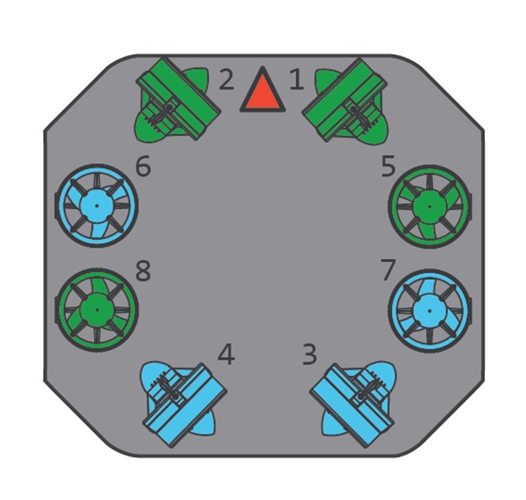 如上面给出的图所示,ROV 一共有 8 个推进器,其中 4 个推进器在水平面上呈对角布置,可以为 ROV 在水平面上的各种运动(包括,平移和原地转动)提供推力。这四个推进器标号为 1-4 。还有四个推进器布置在垂直方向,这四个推进器除了可以为 ROV 提供上浮和下潜的推力外还可以使 ROV 进行俯仰和横滚运动。这四个推进器标号 5-8 。应当注意到,为了防止 ROV 由于推进器的转动而产生的反向的转矩对 ROV 的姿态造成影响,推进器是正反浆对称布置的。其中绿色的为 CCW (逆时针)浆,蓝色的为 CW (顺时针)桨。
