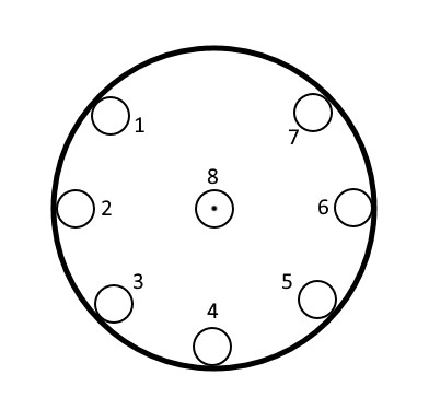 水密接插件使用 8 芯的水密接插件,该接插件的单芯额定电流为5A,接插件的芯线定义(从母头方向看)如下图所示: